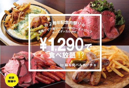 東京・港区麻布十番の肉料理とワインの店「麻布肉バルCiccio」にて期間限定で開催中のオープン2周年記念食べ放題イベント「2周年記念肉祭り」。大好評すぎて、10月末までの延長が決定! ドイツ産ソーセージ、自家製ローストビーフ、生ハム、チーズタッカルビ、バゲット。そして「花畑牧場のラクレット」をプラスして、全...