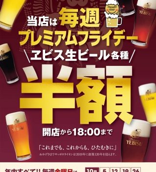 今までプレミアムフライデーにあわせて、全国の銀座ライオンで実施されていた「ヱビス生ビール各種半額イベント」。なんと、なんと、10月以降年内は、毎週金曜日開催! 全国の銀座ライオン、YEBISU BAR(一部店舗除く)にてヱビス生ビール各種が、開店時間から18時まで半額だ。店舗により取扱いのある生ビールの種類は異...