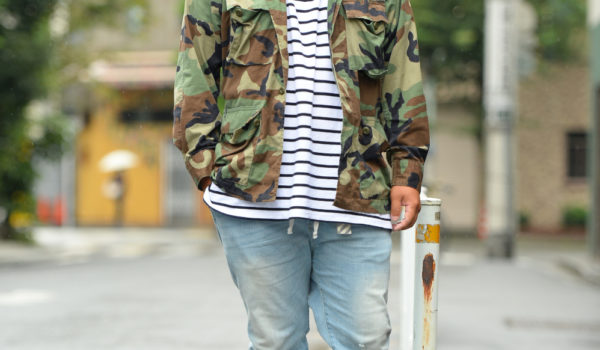 ミリタリージャケットに、ジップ付きの淡いデニムを合わせたさっぱりしたファッション。ボーダーはポチャメンの味方! ビーニーもこの季節こそ活躍します。アウター/古着 ¥1,000 L、インナー/H&M ¥2,000 XL、ボトムス/H&M ¥2,500 32インチ、シューズ/adidas yeezy boost 350 v2 ¥60,000 28cm、帽子/ジャスティン...