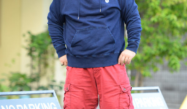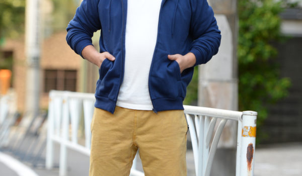 オール無地のワンマイルパーカファッション。青、白、ベージュと配色にも小細工がなく、すっきり見せることに全パラメータを振っています。アウター/H&M L、インナー/チャムス L、ボトムス/BOXY L、シューズ/VANS 26cmけんじさん89kg/167cm/Age:36