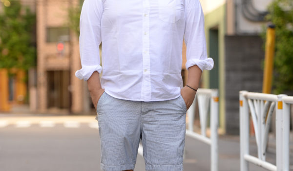 清潔なYシャツ&織りショーパンという休日っぽいリラックススタイル。スニーカーはボタニカルですが、どこか秋を思わせる色合いなのもいい感じです!トップス/45R ¥2,000 5、ボトムス/Abercrombie & Fitch 34インチ、帽子/BEAMS、メガネ/Zoffタケシさん94kg/168cm/Age:45