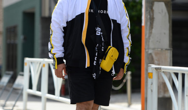 ミニショルダーを含めてイエローをアクセントにしたスポーティな着こなし。べっ甲ウェリントンもハードボイルド。ハイカットスニーカーも重厚感出ちゃってます!吉一智広さん90kg/173cm/Age:36